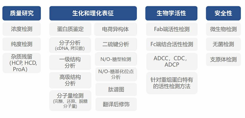 分析方法开发团队为新药研发提供完整的分析方法学服务,对单抗,双抗,重组蛋白的pCQA分析与监控都有丰富的经验。 能支持IND/BLA申报所需的一站式生物药研发服务全流程,包括: